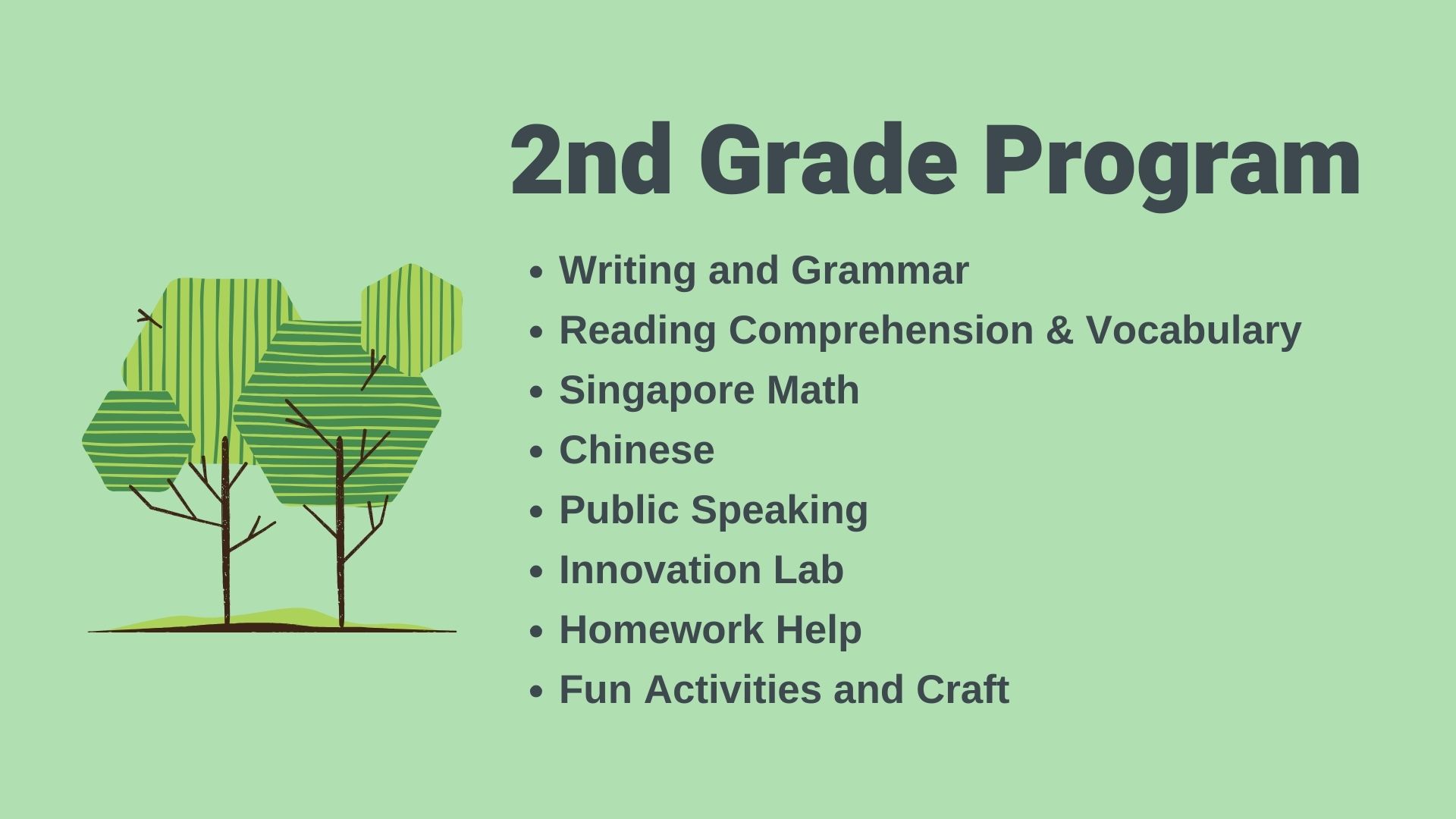 The goal of our 2nd grade English program is to encourage students to be confident in their English ability by continuing to provide a solid foundation of grammar and writing skills. For most students these classes may be their first real introduction to grammar and writing strategies. Our English curriculum helps our students to read comprehensively, write creatively, and speak fluently.