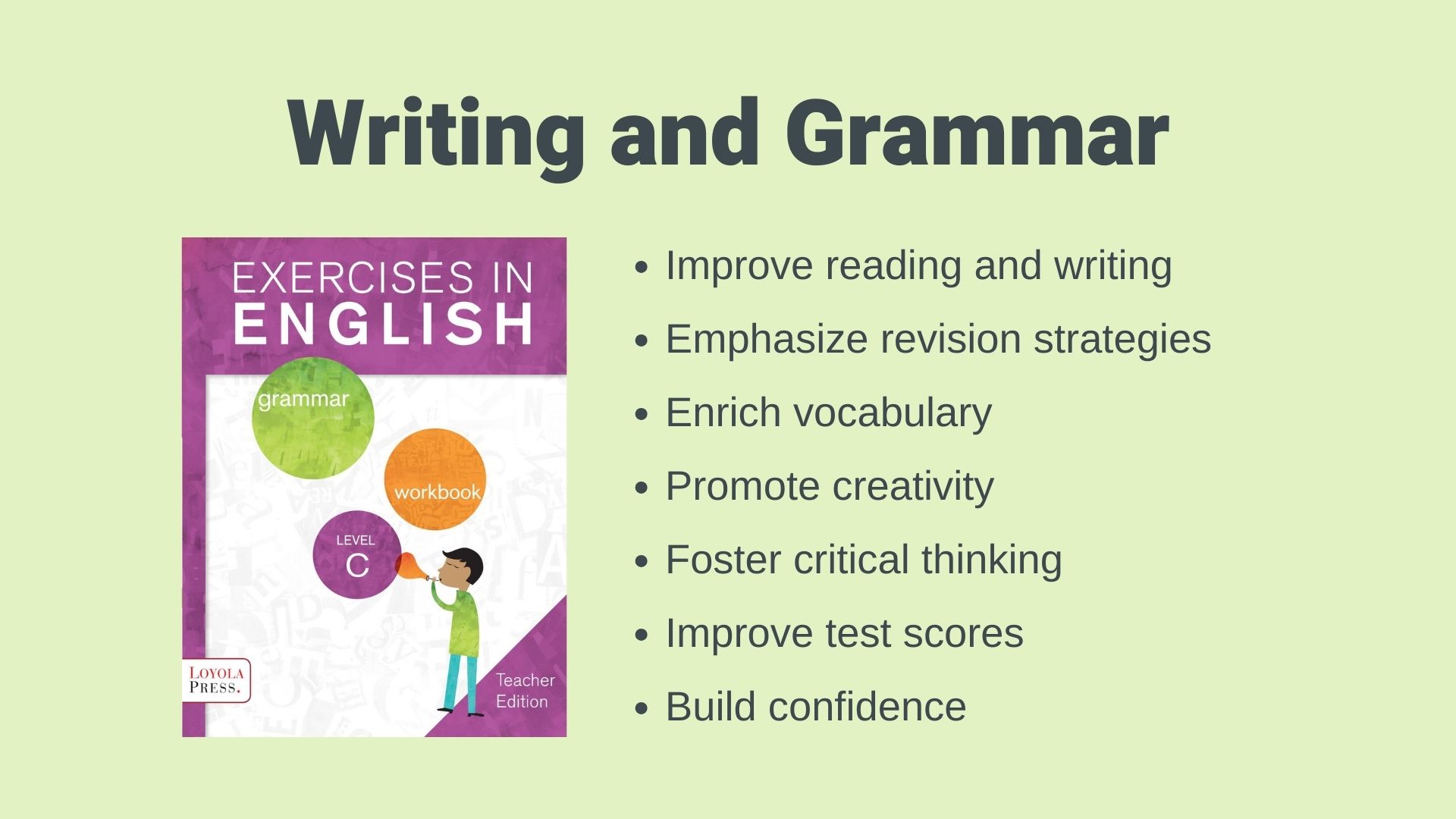 Most classrooms have only a little time to spend working on grammar which is a building block of written and spoken language. Our program encourages children to learn all the basics of grammar and build on any writing mechanics they have already absorbed.