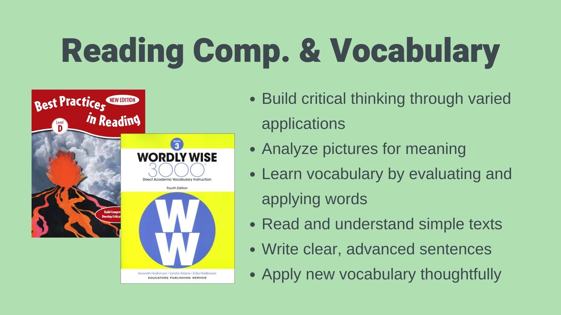 The vocabulary portion teaches students not only new words, but new meanings to words with which they already are familiar. There is an element in each lesson that allows the student to see the words in action and to use them in answering comprehension questions as well.
