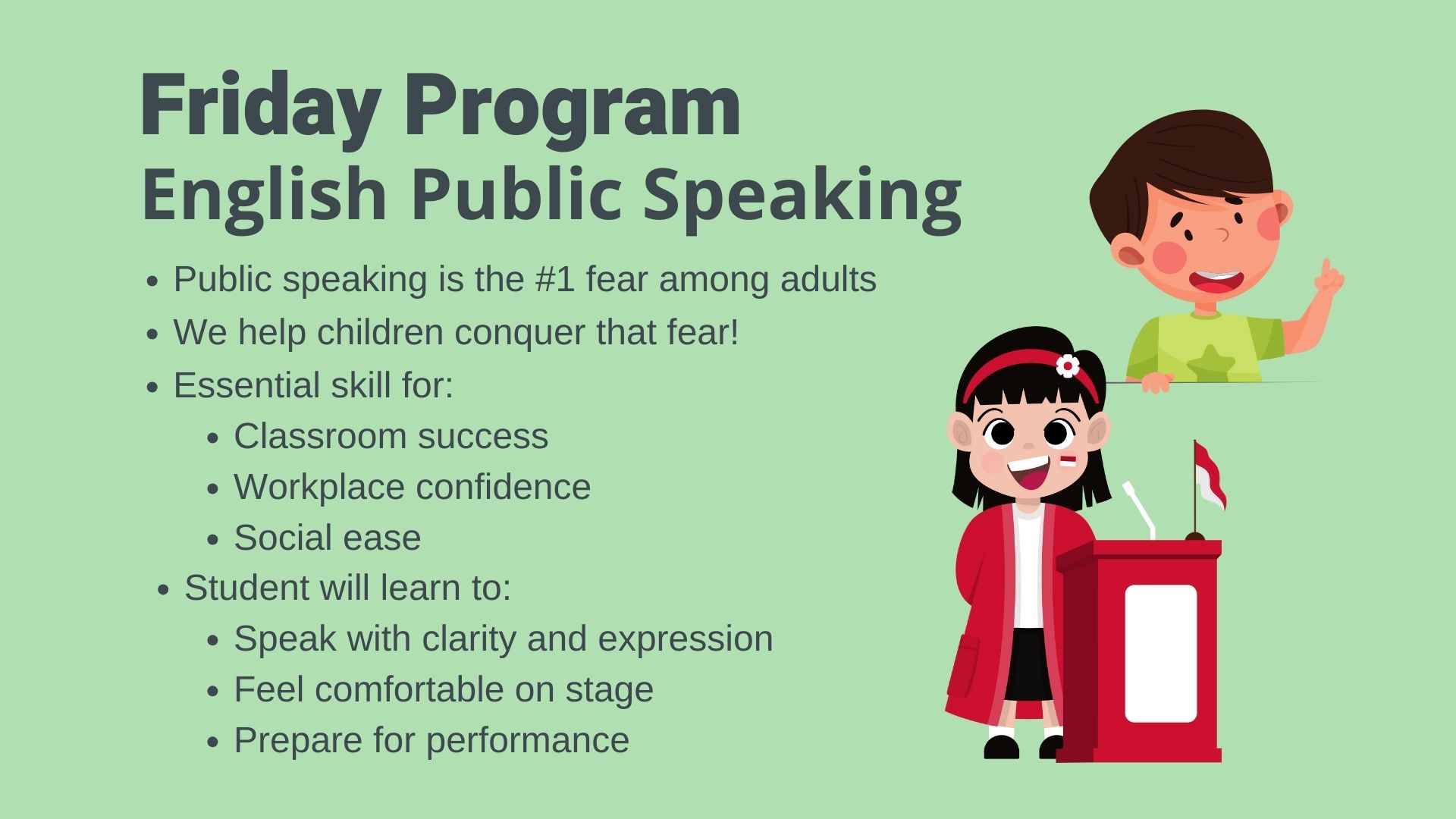 Did you know the number one fear among adults is public speaking? We can help your child conquer that fear! The ability to competently speak in front of others is an important trait needed in the classroom, in the workplace, and in social arenas. Your student will learn to be more comfortable in front of an audience, speak with expression and clarity, and prepare for a performance.