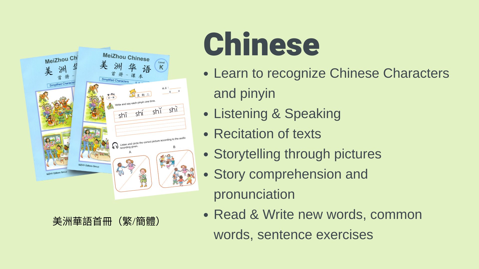 We primarily teach students to recognize Chinese characters and use pinyin to support teaching. By focusing on characters, students learn to avoid relying on pinyin, which can commonly lead students to mix spelling with English words. Furthermore, this Chinese learning process helps students recognize Chinese for its practicality in society and everyday use. Students will begin to recognize both traditional and simplified characters. All lessons contain a combination of styles, challenging traditional students to read simplified but write traditionally and vice-versa. This process gives our students a dual advantage and makes Genius Academy’s Chinese program a wise choice.